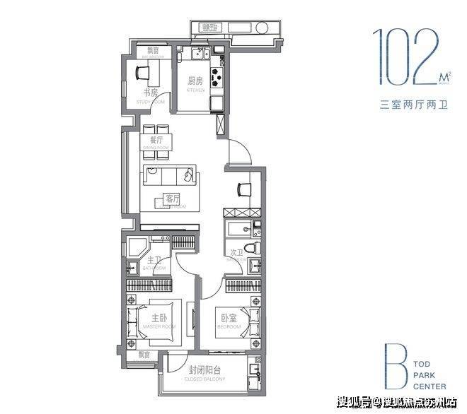 而北向房间则布置了次要的厨房、次卫、书房和主卫功能,做到功能层级合理的基础上,最优化的提供南向面宽和缩窄户型整体进深。这样带来的优势就是户型整体的采光和通风都极为优越!