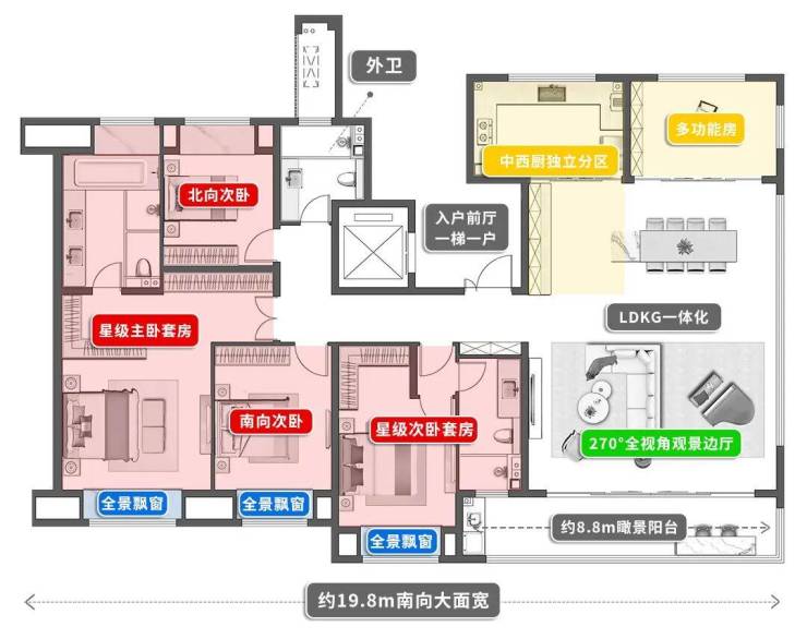 作为项目上新的王炸户型,最大亮点就是270°奢阔边厅+约8m观景阳台,双面采光,将270°的景观纳入这个家,让绿色环绕生活。