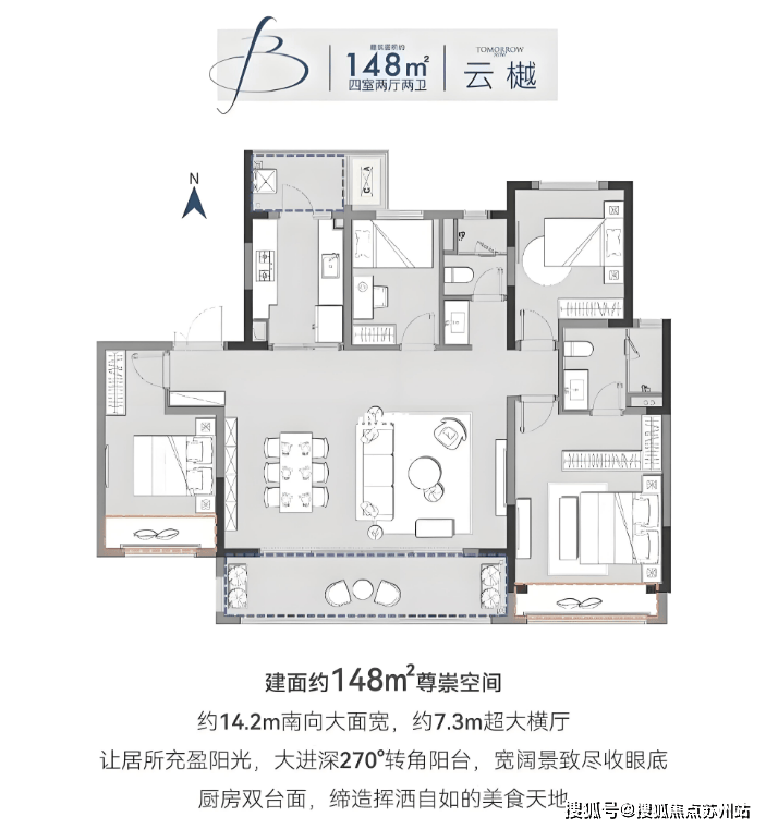 主力户型:129㎡四室两厅两卫(总价约260万起)、148㎡四室两厅两卫(总价约300万起)