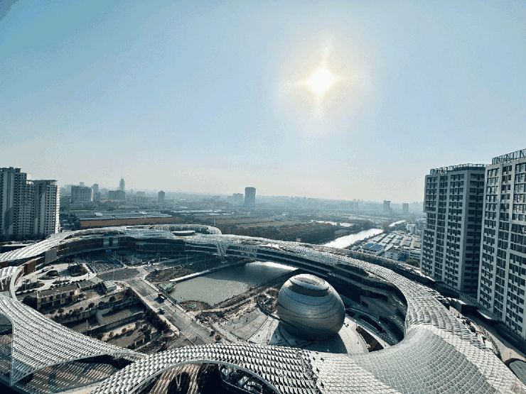 这座商业通过“江豚相逐”造型的天幕环街串联起来,巨型球体影院则成为这条“项链”上“夜明珠”。