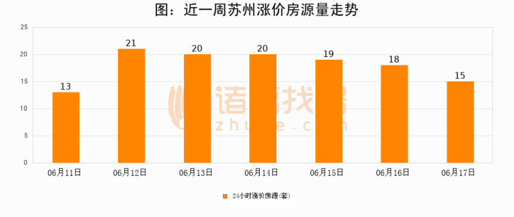 根据诸葛找房数据显示,苏州24小时涨价房源量为15套,较06月16日减少3套,环比下降16.7%。与此同时,涨价房源占比小幅回落,对于购房者来说是一个入市窗口期,购房者可抓住时机入市。