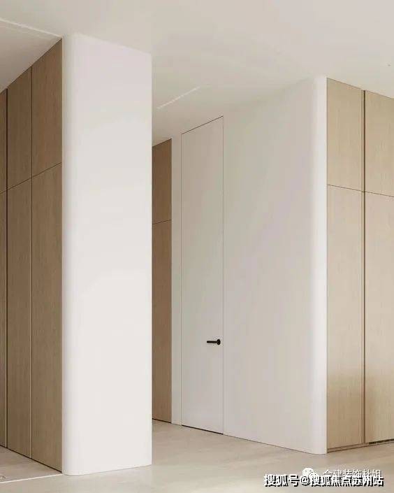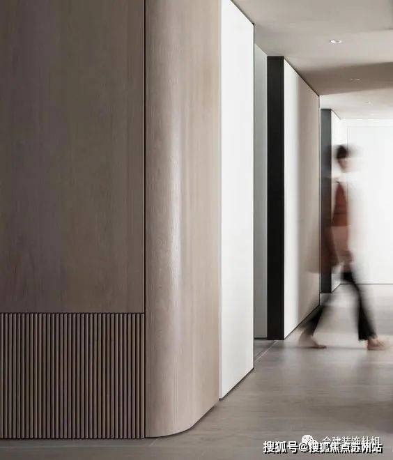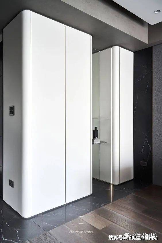 2、过道与卫生间墙体转角做了弧形墙面设计,呼应门厅以及一些定制衣柜的设计,卫生间稍微增大了一点,次卧还是正常的卧室空间。