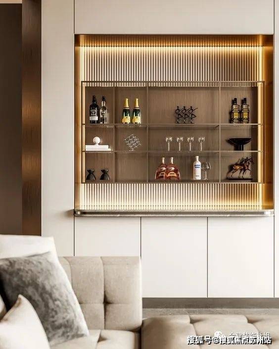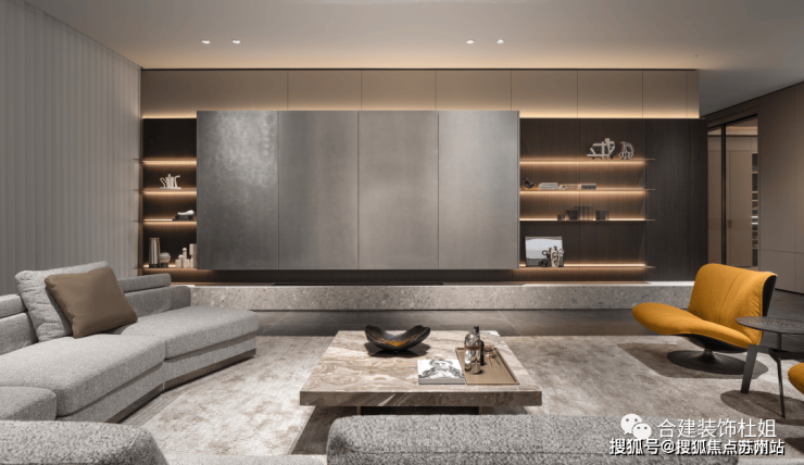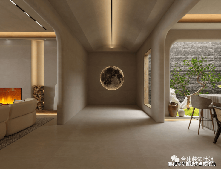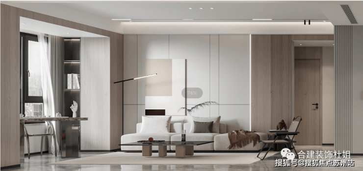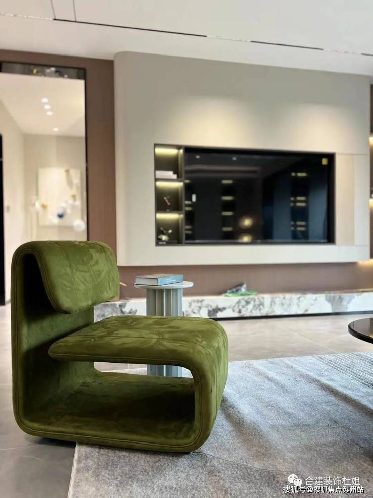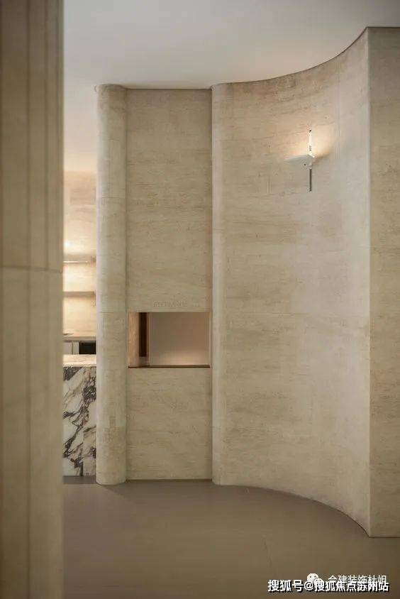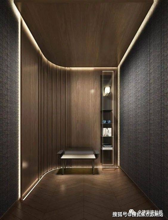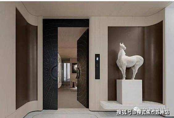 这个参考图片中,弧形不锈钢板的作用:一方面美观,另一方面给人一个视觉动线方向引领的作用,引导人往更大的客厅空间迈步。