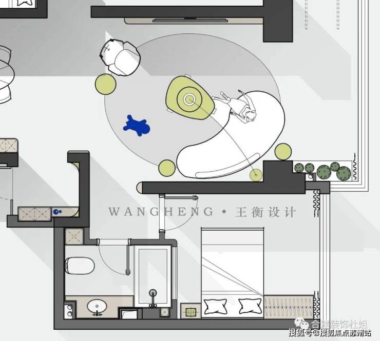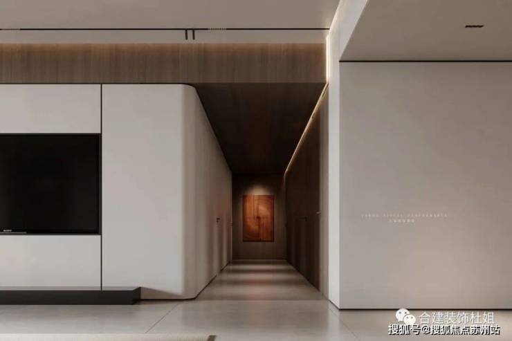 3、沙发一侧考虑到人回次卧,去公卫,同时延长沙发背景墙尺寸的问题,也做了一点弧形优化。