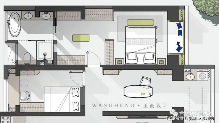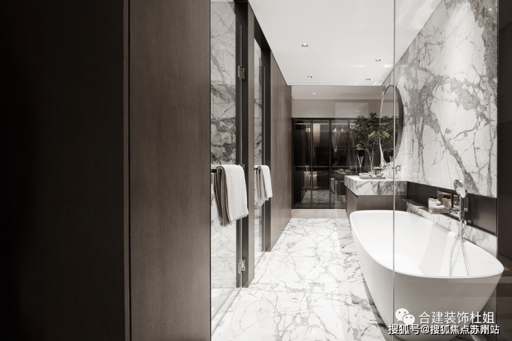 设计了两个独立的衣帽间,可以做到男女主人分开,卫生间也保留了浴缸以及干湿分区, 干区设置双台盆。