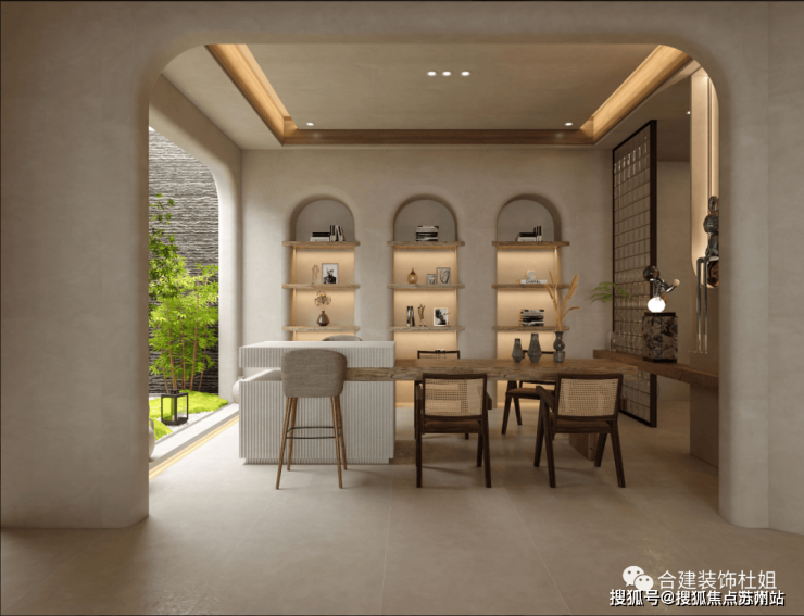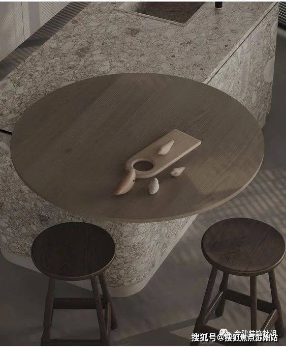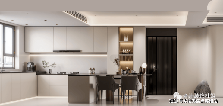 第二个方案,餐厨一体化思路,厨房跟餐厅没有做明确界限,融为一体,把岛台设计的更美观一些,也还可以兼顾一部分收纳功能。