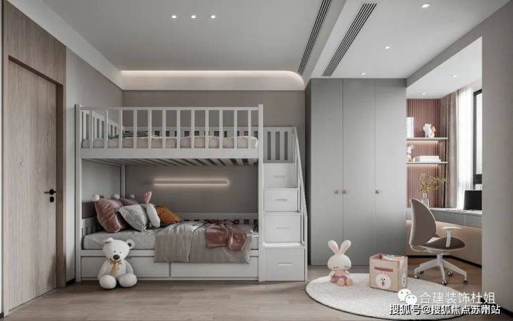 其它两个房间我们也给出了几种不同的方案,居中放床或者靠边放、高低床以及常规床。