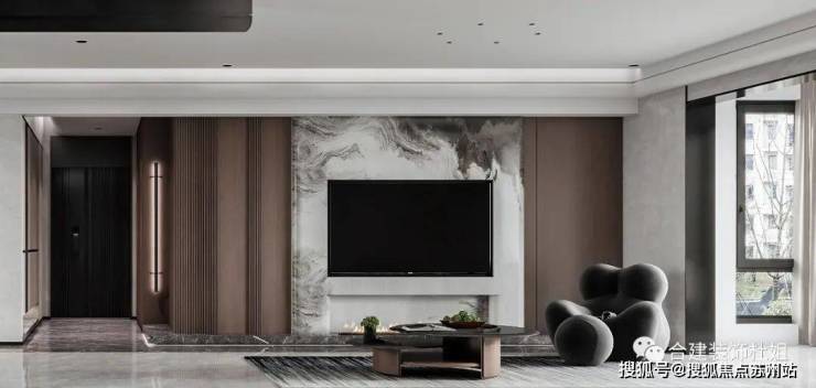 2、电视背景墙我们只设计了内嵌电视机的厚度,还是以平造型为主,尽可能保证原有空间的尺度感。也内退了700-800㎜的空间,方便人从客厅回主卧,右侧不会有凸起,解决易磕碰的问题。