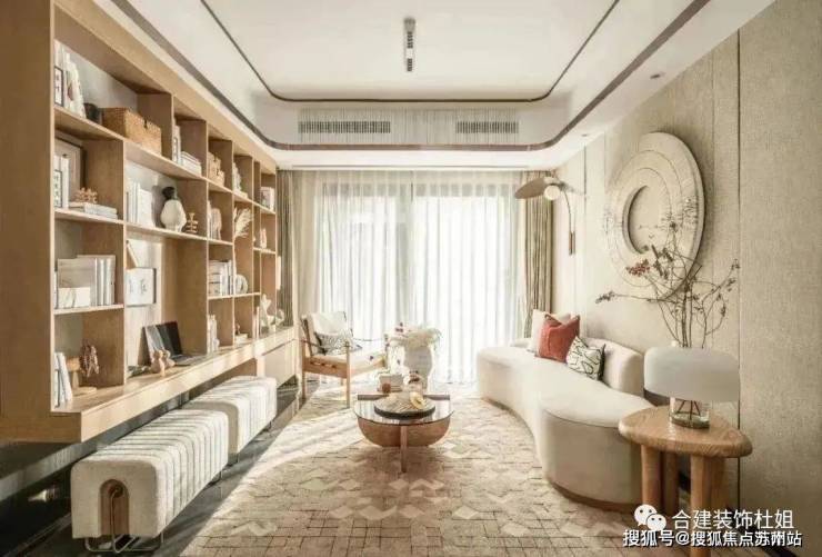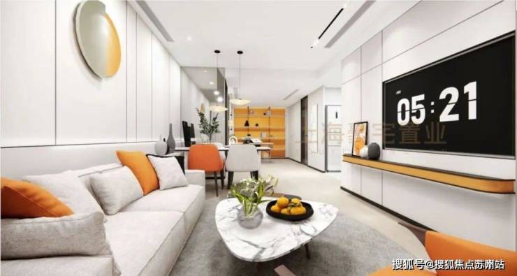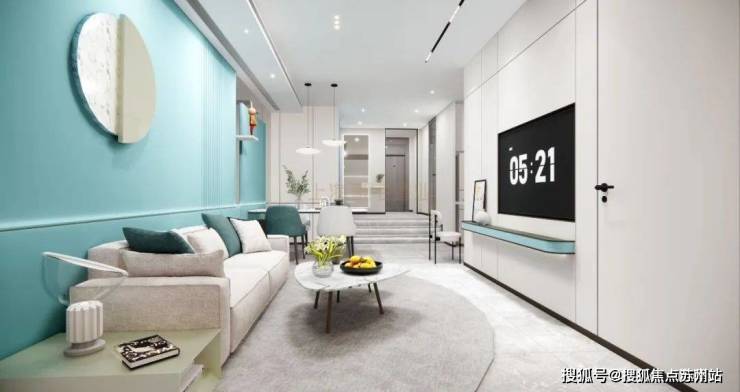 1、设计放置弧形沙发,可以借用一部分阳台空间,坐在沙发上不仅可以看电视、也还可以看楼下小区园林景观。因为是弧形,沙发尺寸也可以比常规一字型更长一些。
