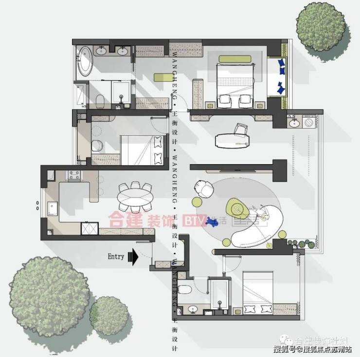 先来看第一个方案:三房+开放式书房思路。