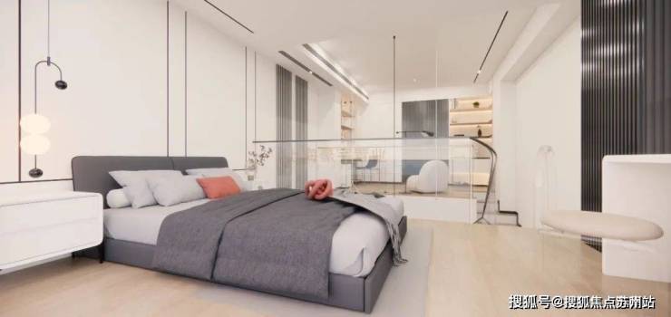 3、主卧的床头我们调换了方向 朝向室内一侧,一来能解决卫生间门避开床头床腰的问题, 二来床尾一侧也可以加一个悬浮挑台,内置灯光,方便起夜或者增加气氛感,上方也可以加投影。