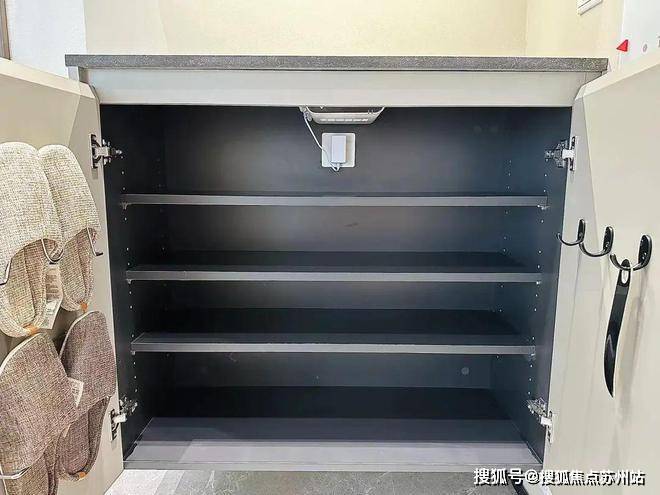 同时,玄关柜的细节打造,也非常亮眼。比如 内设除臭机,净化空气; 台面人体感应灯带,进门不必打扰家人休息; 柜内层板可调节,各种高度的鞋子都能轻松摆下;甚至柜体下方还预留了扫地机器人的位置...