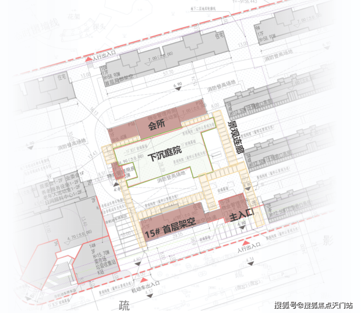 位置放在了南北两栋楼中央,从南侧主入口进入后,还需要比较长的步行距离才能达到下沉庭院,与现在常见的主入口直接连着会所的形式不太一样.