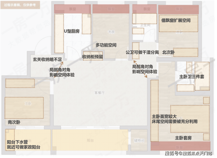 此外,进门玄关,以及客厅东北角均有“角对角”的墙体格局出现,一方面使用感受略有影响,另一方面可能卡住大件家具进出,同样建议实际体验来做决定.
