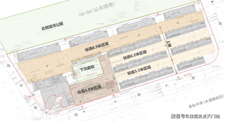 从公示的总图上来看,地块南侧场地标高在4.8米,北侧已经到了6.9米,有2.1米的高差.