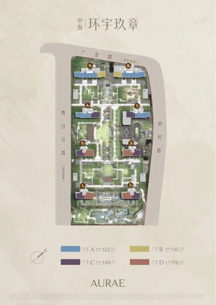 项目一共规划了8栋住宅,北高南低排布,户型上预计推出建面约123-176㎡3-4房。