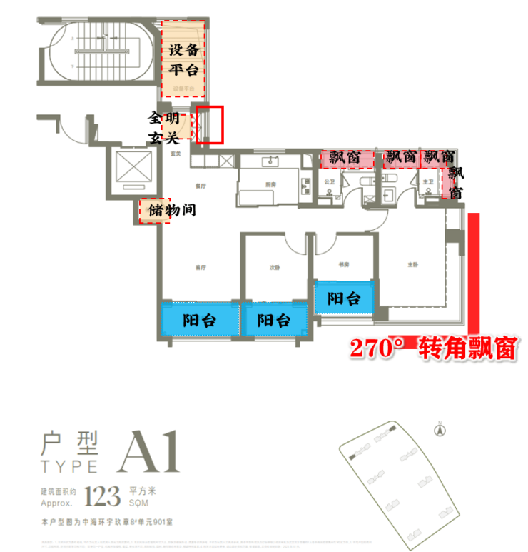 同时户型还做到了全系多阳台设计+高实得率!以主力建面约123㎡3房为例: