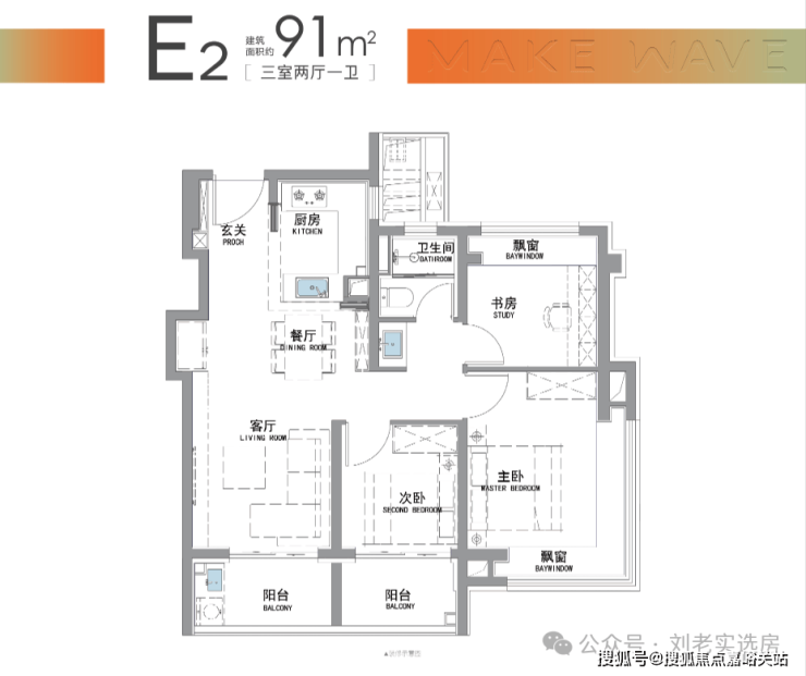 而招商·时代潮派|东屿此次建面约91㎡户型,就做出来了比市面百平户型更好的的“南向双阳台+南北双飘窗”设计。