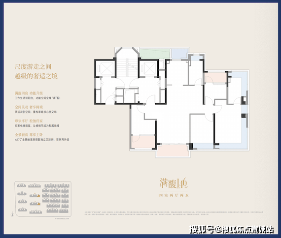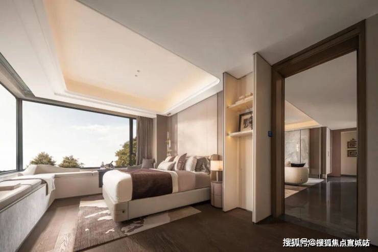 主卧套房面宽达4米、进深5.5米,配备270°转角飘窗(边套),视野与舒适度拉满;