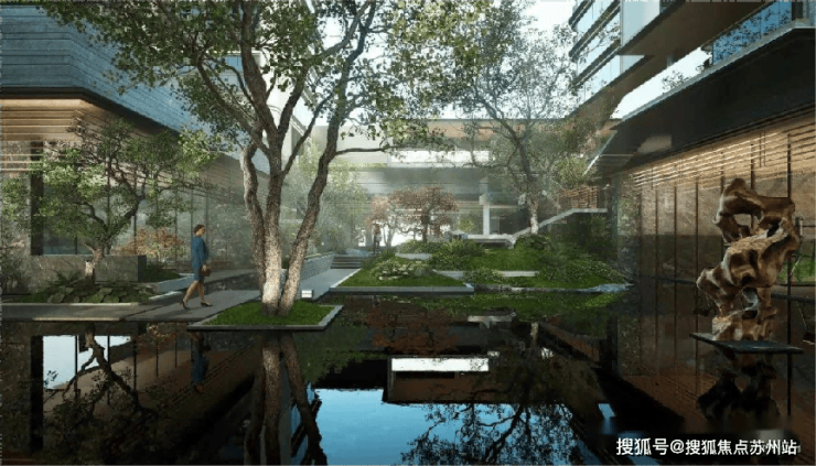 依凭半岛三面水岸的天然资源,以"一堤三面湖"和"水街襟两园"设计笔触,实现滨水互动、开门见水的场景体验;融汇吴门画派、苏州园林造园理念,营造出一座温润如玉的流动庭园。