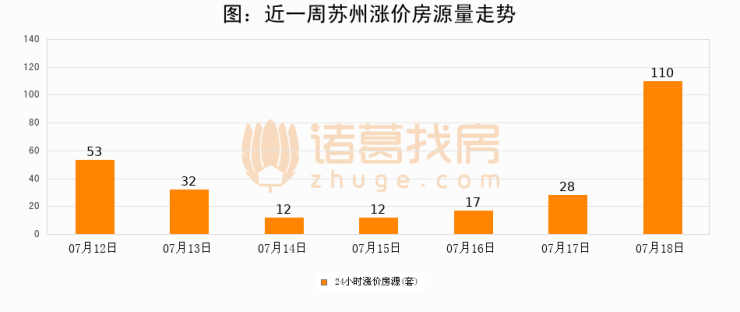 根据诸葛找房数据显示,苏州24小时涨价房源量为110套,较07月17日增加82套,环比上涨292.9%。与此同时,涨价房源占比小幅扩大,业主信心有所提升。