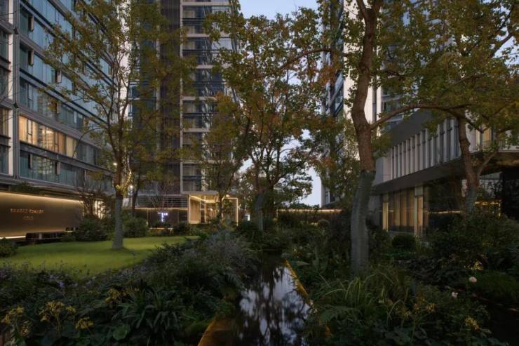 走入T-ONE潮博西区的园区,可以看到一条蜿蜒的水系串联着不同场景,贯穿整个楼盘。在这里,Pok是结合了杭州「钱塘江潮」的在地文化,用溪流与叠水打造出了一座很有度假感的花园。花园中,凡是有户外座椅的地方,就会有微风、树荫与水流的环绕。