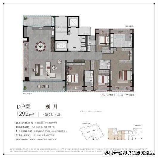 朗月名筑售楼处电话☎:400-882-8814(预约热线)✔✔✔建面约292㎡户型,在客厅设计上,基于令人吃惊的建面约100㎡尺度,跳出客厅的概念,而是围绕市面极为少见的L型转角大飘窗(有结构柱),形成约270°环幕剧场,融壮阔与浪漫与一体。