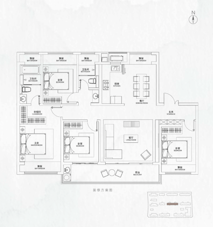 D户型 跃云间 168㎡(4房2厅3卫):奢阔洋房代表作,得房率高。LDKB一体化设计让客厅、餐厅、厨房、阳台巧妙相连,成为家庭社交C位。全屋飘窗设计,最大化引入阳光与风景,定义了高铁新城楼盘的高端居住体验。