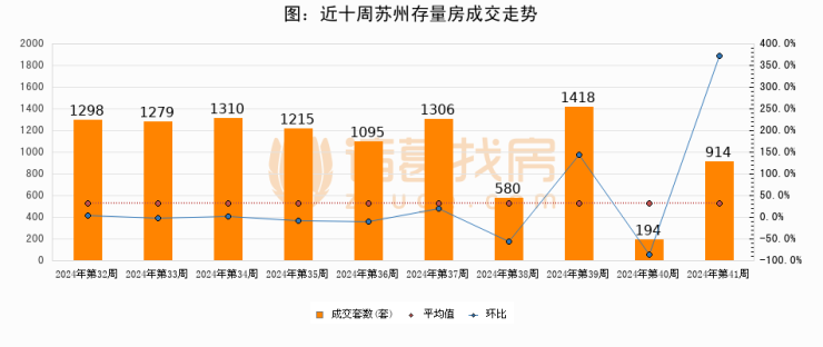 存量房方面,第41周苏州存量房成交914套,较上周增加720套,环比上涨371.1%。从近十周成交走势来看,周均成交套数为1060套,本周低于平均水平13.8%。