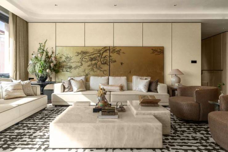 从大门口的皇家碧玉+月光米黄,到外立面的月光米黄,再到会所大面积使用的黑色原石石皮以及福鼎黑,可以用入目处皆是石材来形容。