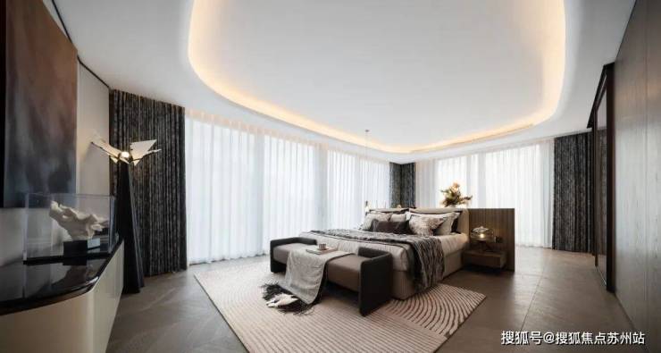 二楼主卧套房,同样大开间,面积做到了惊人的近60㎡,同样拥有270°转角阳台,仅一层的尺度感,就堪比市面上200㎡+的大平层。