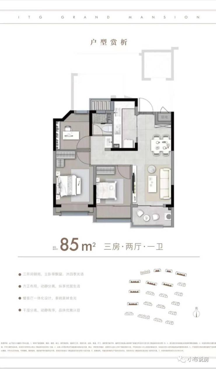户型解析:约85㎡的3房,这种入门级的产品也要保证居住的尺度感。比如利用L形厨房与餐厅相连接,一体化的设计让空间充足利用。比如次卧连接阳台,就是人性化考虑到给他们一个私密的追光天地。
