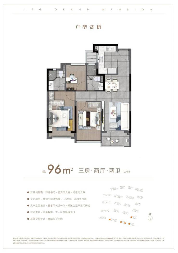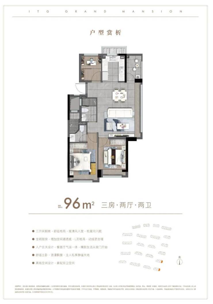 户型解析:约96㎡的3房,这种进阶级的产品当然最能体现舒适感。比如在入户动线上,客餐厅LDK设计更能凸显与家人的亲密交融。同样也利用客厅阳台,次卧阳台,主卧飘窗,北向书房飘窗这些更多的开窗面,向阳而生。