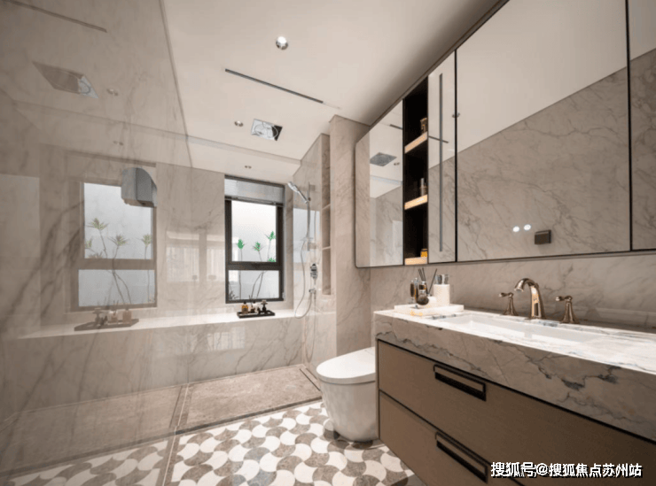 卫浴方面,地面及淋浴区,全部选用石材,墙面的公主白玉岩板,温润暖色调,质感非凡。