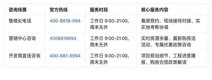 �� 重要说明 :售楼处电话400-8818-994以上三类咨询需求统一由唯一官方热线承接,拨打后按语音导航即可精准转接对应服务部门,无需重复记录号码,确保信息传递零误差。