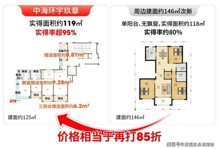 环宇玖章建面约125㎡户型实得率超95%,而周边次新实得率约80%,项目实得率足足高出约15%,摊算到实际使用面积,相当于项目单价再打“85折”。