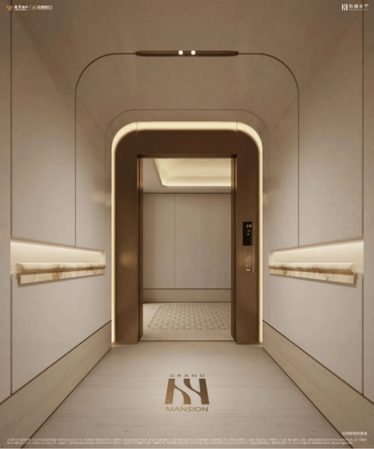 公区部分,基本以古铜色金属、暖色灯光和米色石材搭配,以“公区室内化”概念来打造更好品质体验;