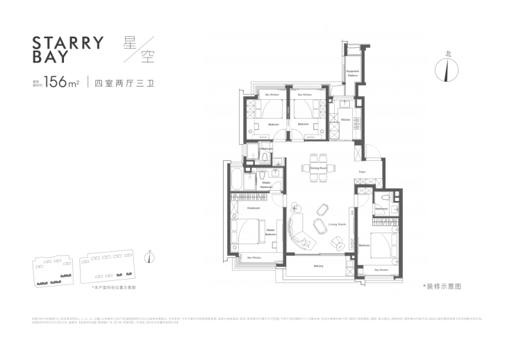 主力户型:156㎡、181㎡、222㎡四房三卫,得房率约80%