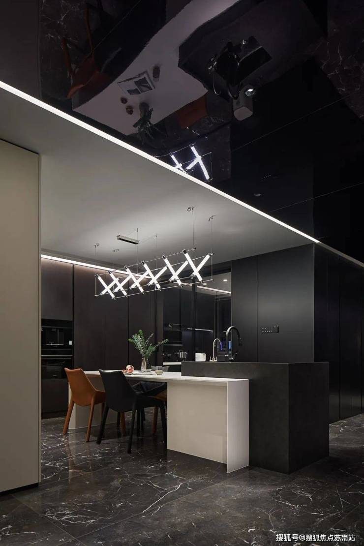 与客厅相比,餐厅对黑色的运用更为多元。设计师巧妙地运用不同材质,吊灯与精致器皿相得益彰,一幅城市墨画定格了时间,伴随着富有格调的三餐四季。