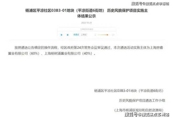 上海杨浦瑞安·翠湖滨江售楼处电话☎:400-8123-664(预约看房热线)2022年10月25日,杨浦区人民政府官网发布公告,杨浦区平凉社区03B3-01地块(平凉街道6街坊)历史风貌保护项目实施主体结果公示:“本次遴选活动实施主体为上海房睿职业有限公司(60%)、上海杨树浦置业有限公司(40%)。”