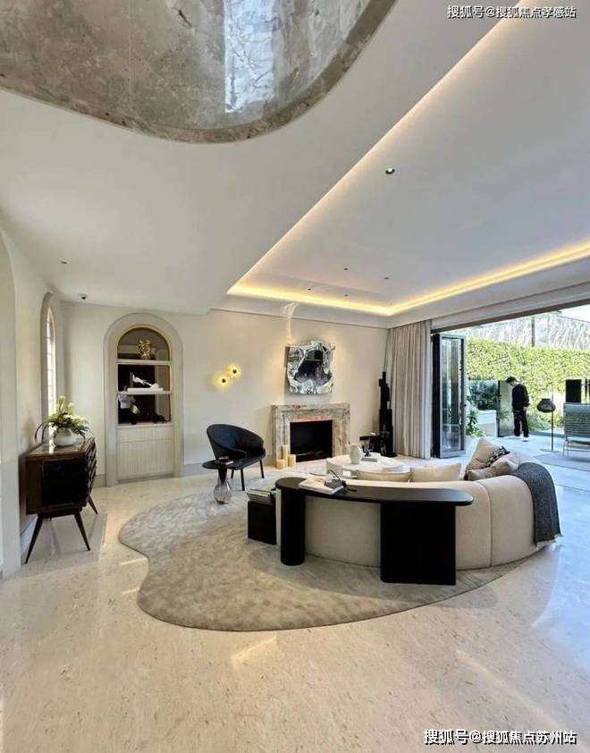 「无界空间」:客厅270度转角无柱设计,搭配落地玻璃,开阔视野将院中风景迎入日常。