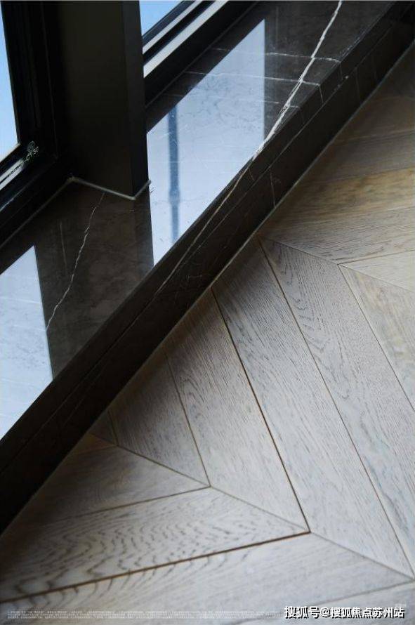 落地窗下的窗槛为天然大理石,搭配精致的鱼骨拼地板,美观又有质感。