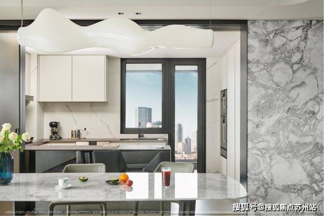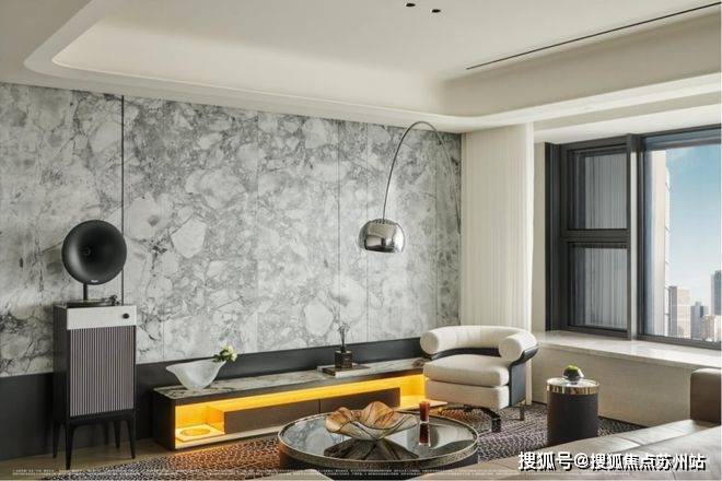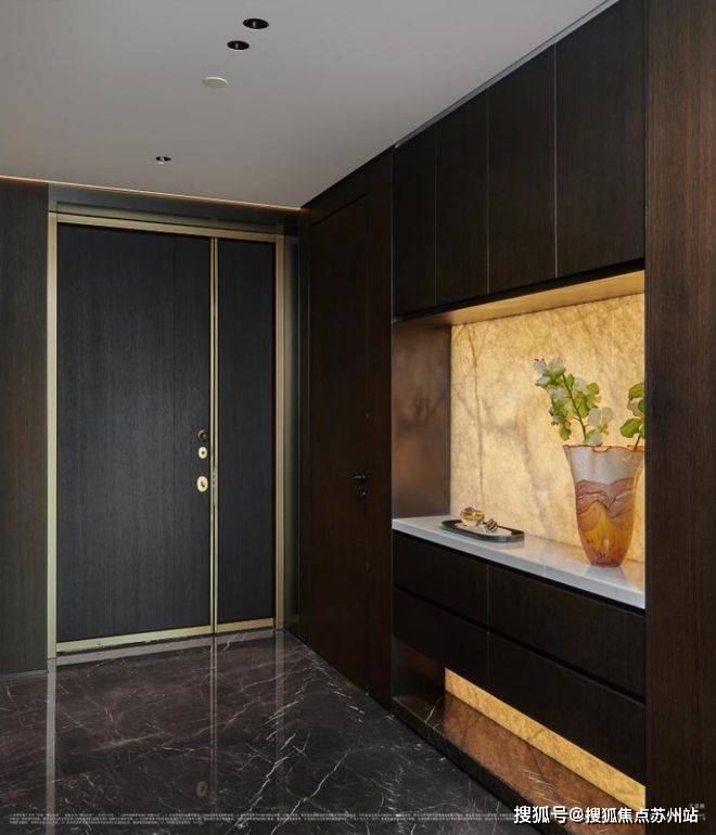 户内玄关后面有一整块温润的透光云石,在光影的透亮下就像是一片斑驳的梧桐树影在摇曳。