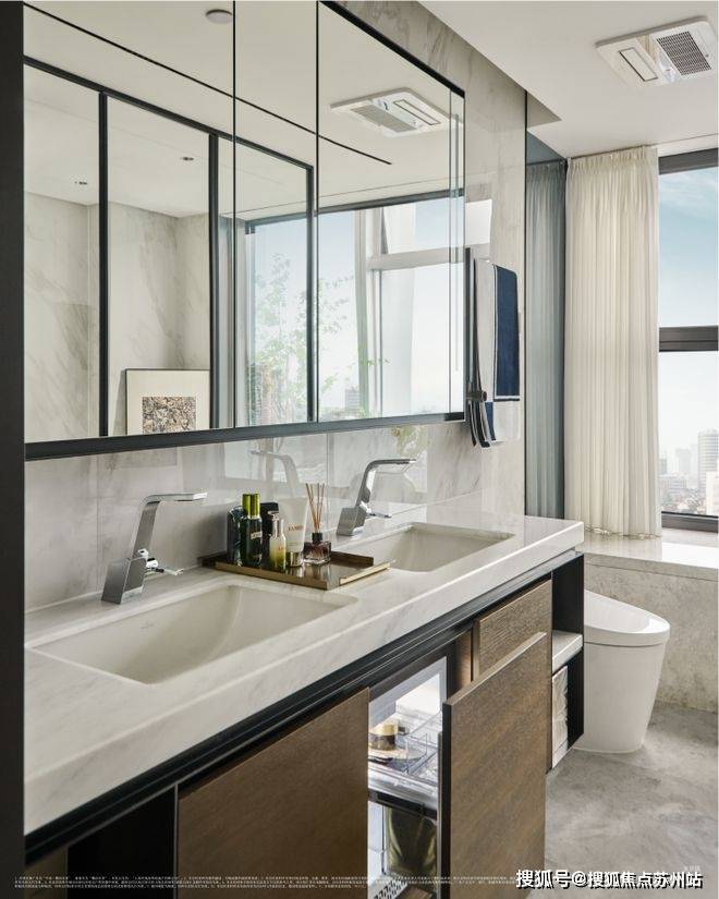 主卫台面选用整块天然大理石,台盆整切嵌入,天然无缝。