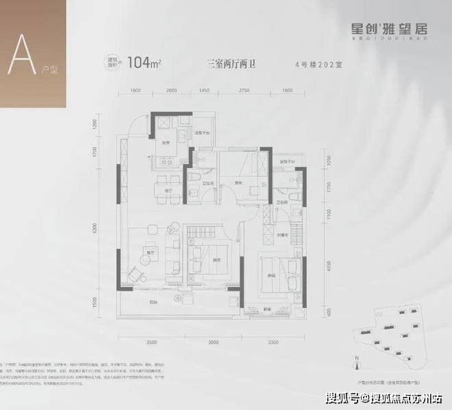 套数最多的104方A户型,动静分离,三开间朝南带南向连通阳台,采光不错,晾晒、休闲也都足够,主卧套房设计带步入式衣帽间和独立卫生间。