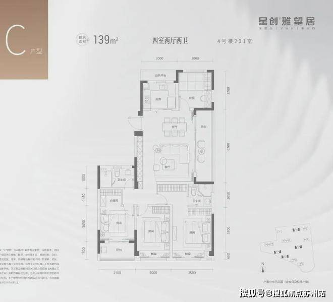 139方C户型四房两厅两卫,边套格局,客厅和次卧均带阳台,三个卧室朝南,一房朝北。南向双主卧套房设计,尺度阔绰,可供三代同堂轻松入住。