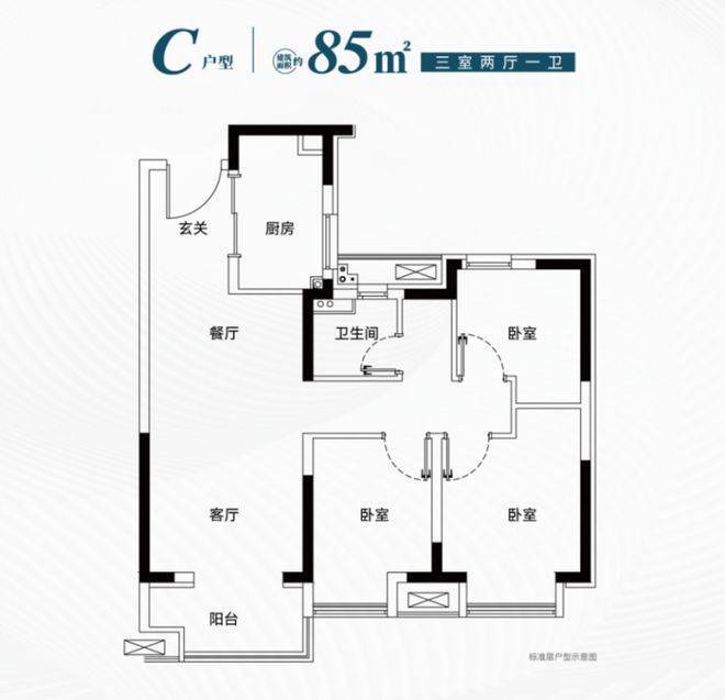 建筑面积约85㎡三房:三开间朝南,餐客厨一体化,特别适合年轻的三口之家。