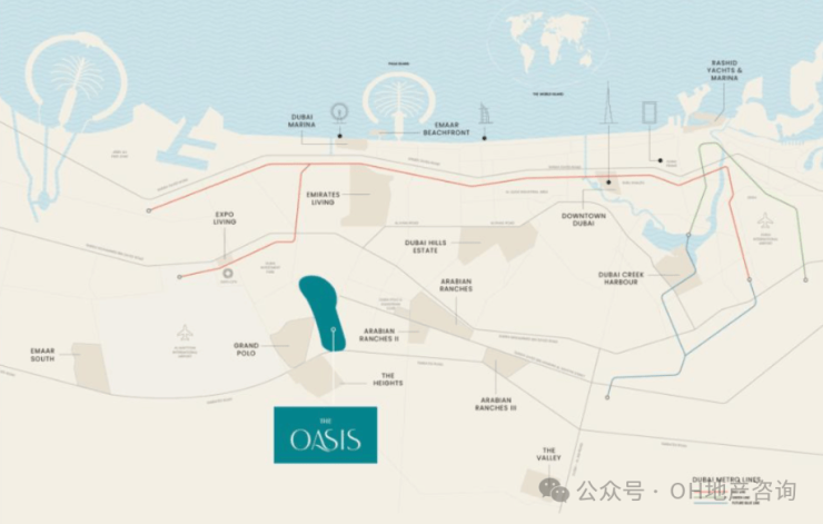 TheOasis坐落于迪拜东南部核心活力区,与朱美拉高尔夫庄园无缝衔接。通过AlFayRoad与SheikhZayedbinHamdan路的立体路网,18分钟直抵阿勒马克图姆国际机场,25分钟即达市中心。伴随迪拜城市重心向南迁移的规划落地,这里不只是生活绿洲,更是未来城市发展的“黄金十字路口”。