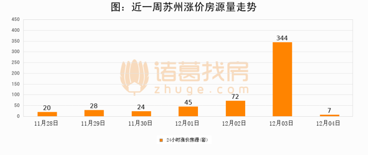 根据诸葛找房数据显示,苏州24小时涨价房源量为7套,较12月03日减少337套,环比下降98%。与此同时,涨价房源占比小幅回落,对于购房者来说是一个入市窗口期,购房者可抓住时机入市。