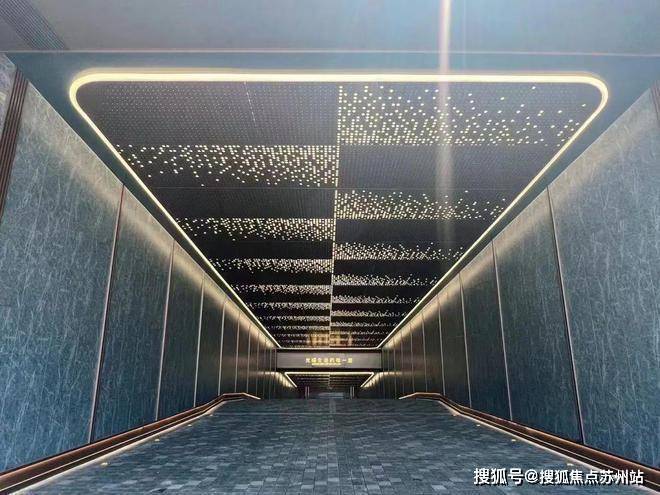 星空连廊的顶面采用香槟金铝板、墙面为爱马仕灰仿石砖,并镶嵌金属线条、就连地面都采用了夜里雪仿石砖。